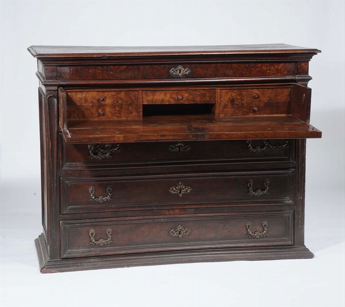 Cassettone in legno di noce e radica, Italia Centrale XVII secolo