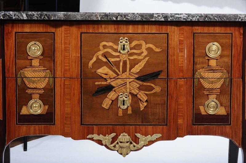 fronte dritto a due cassetti decorati da intarsi raffiguranti allegoria della musica entro due anfore, le quali vengono riprese sui fianchi, lesene oblique arricchite da applicazioni in metallo dorato, gambe arcuate e piedi calzati da sabots in bronzo dorato. Piano in marmo, cm 110x54x86