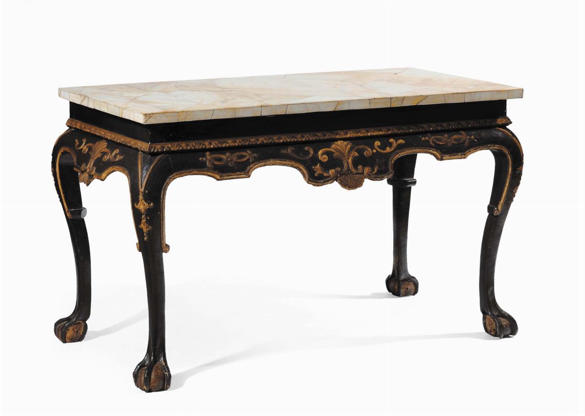 Console Luigi XIV laccata nero e oro, piano in pietra serena lastronata in marmo giallo di Siena, XVIII secolo
