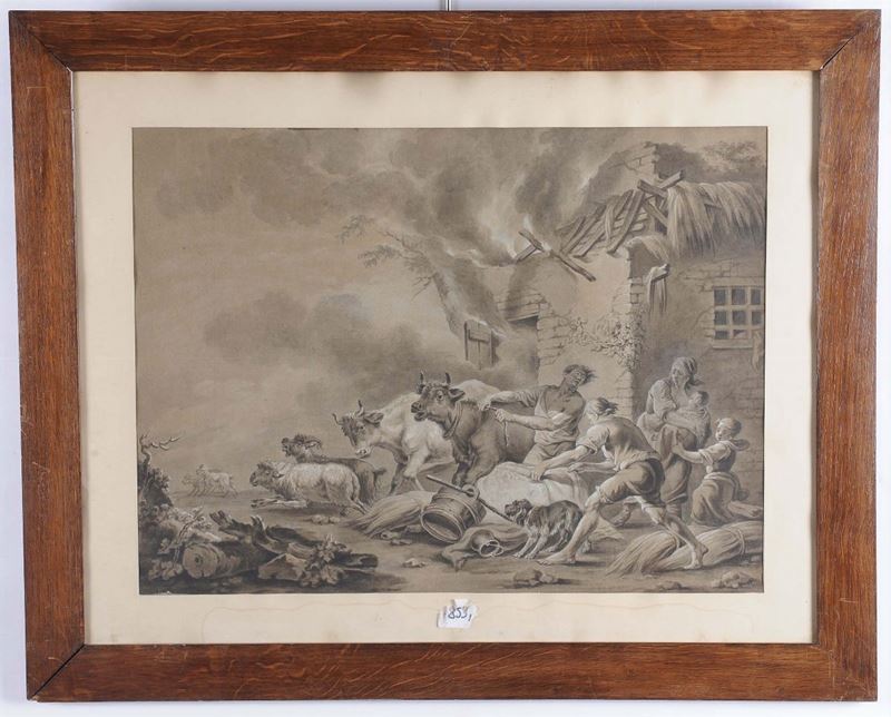 Coppia di grisailles raffiguranti figure con animali su barche, fine XVIII secolo