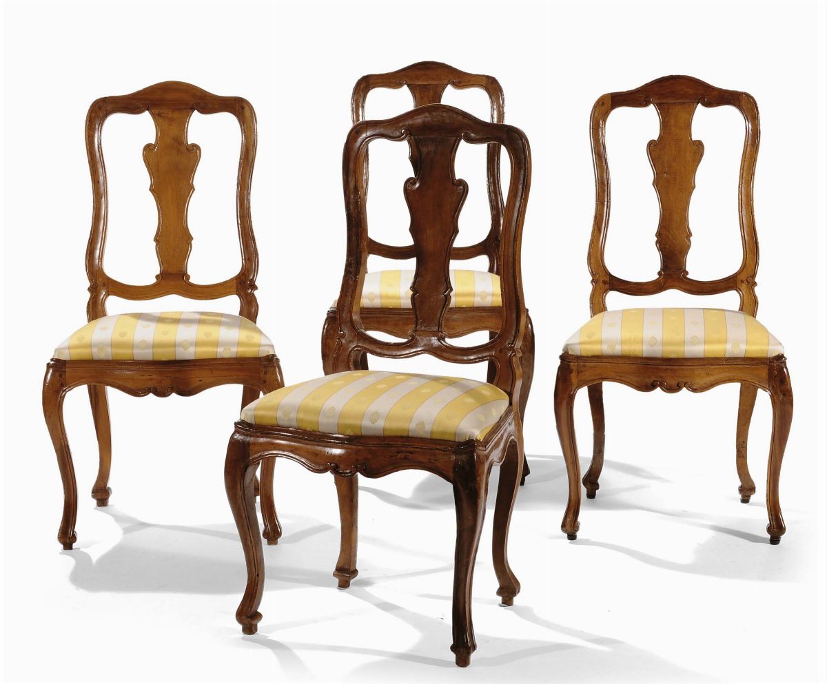 Quattro sedie Luigi XV con schienale a stecche, XVIII secolo
