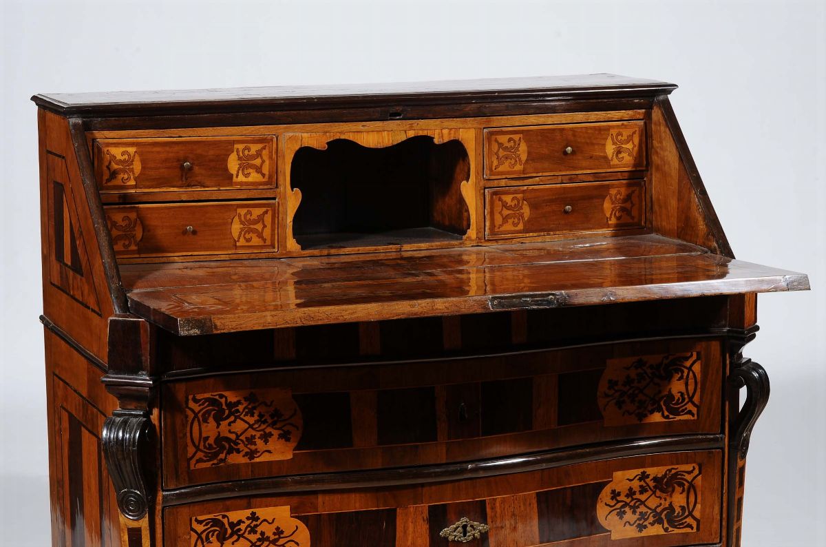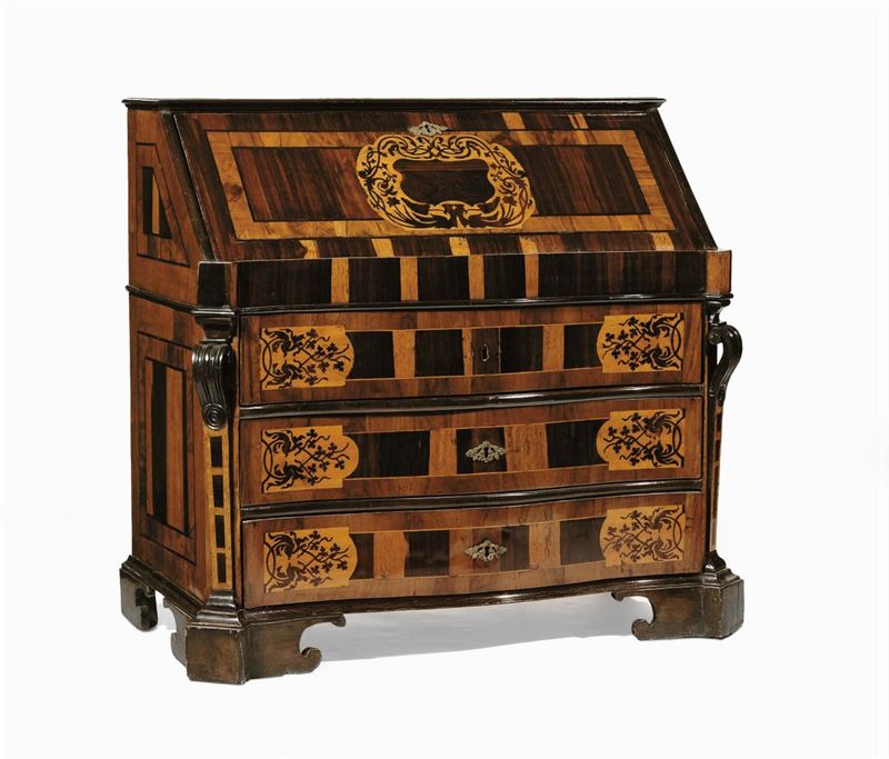 fronte mistilineo a tre cassetti separati da traverse e decorate da formelle delimitate da motivi di girali e volute fogliate, la calatoia, decorata da medaglione centrale, cela scarabattolo formato da quattro piccoli cassetti e vano a giorno centrale. Lesene angolari a doppia voluta, fascia di base modanata, piedi a mensola, cm 113x58x108