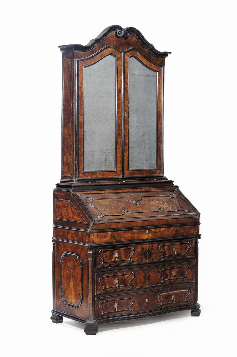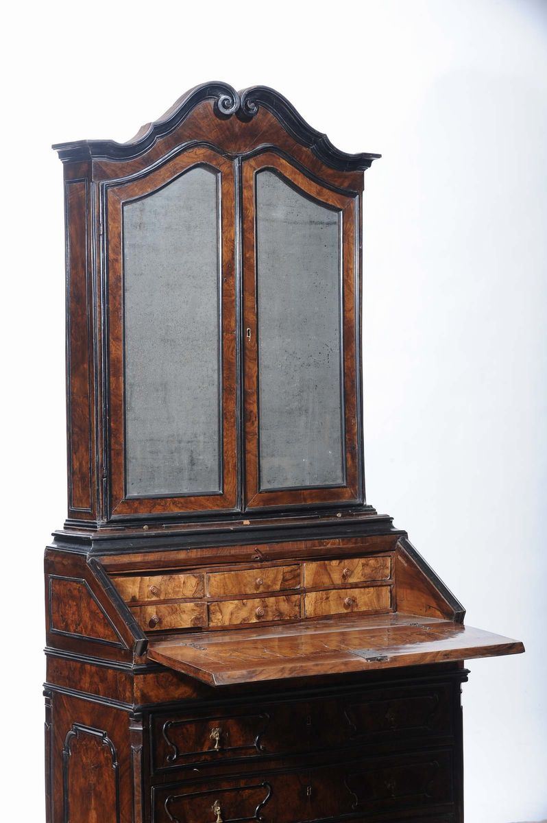 base con fronte mosso a tre cassetti separati da traverse ebanizzate, un quarto cassetto sotto la calatoia che cela sei cassetti, alzata a due ante a specchio coronata da cimasa a ricciolo, piede a mensola, cm 104x53x225
