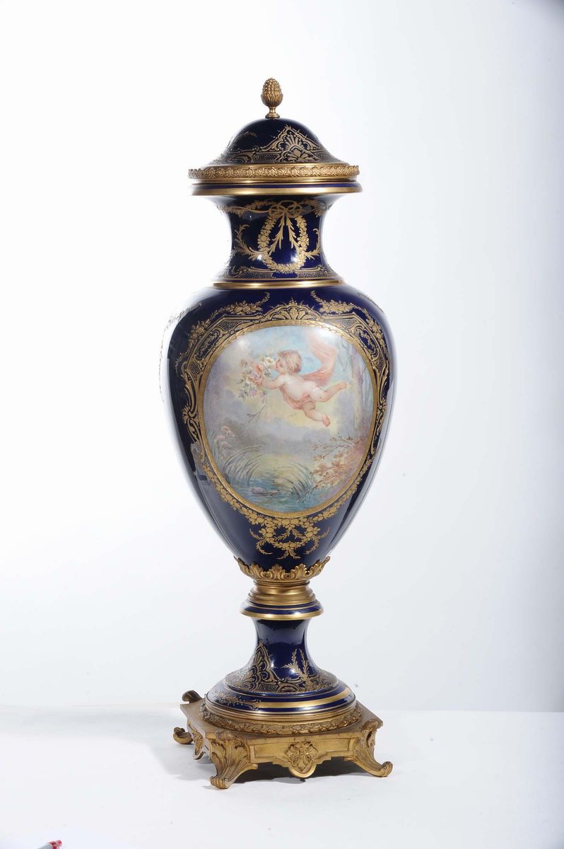 decoro a fondo blu, riserve dorate con scena galante e amorino policromi, base in bronzo dorato, coperchio con presa a pigna, altezza cm 95