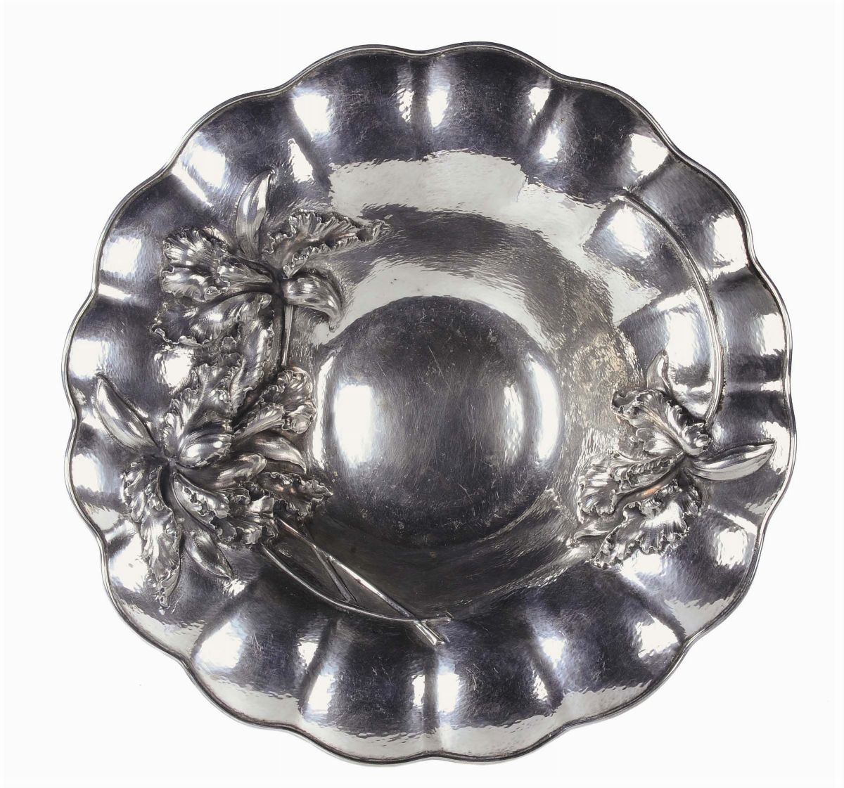 Grande piatto in argento sbalzato con foglie a rilievo