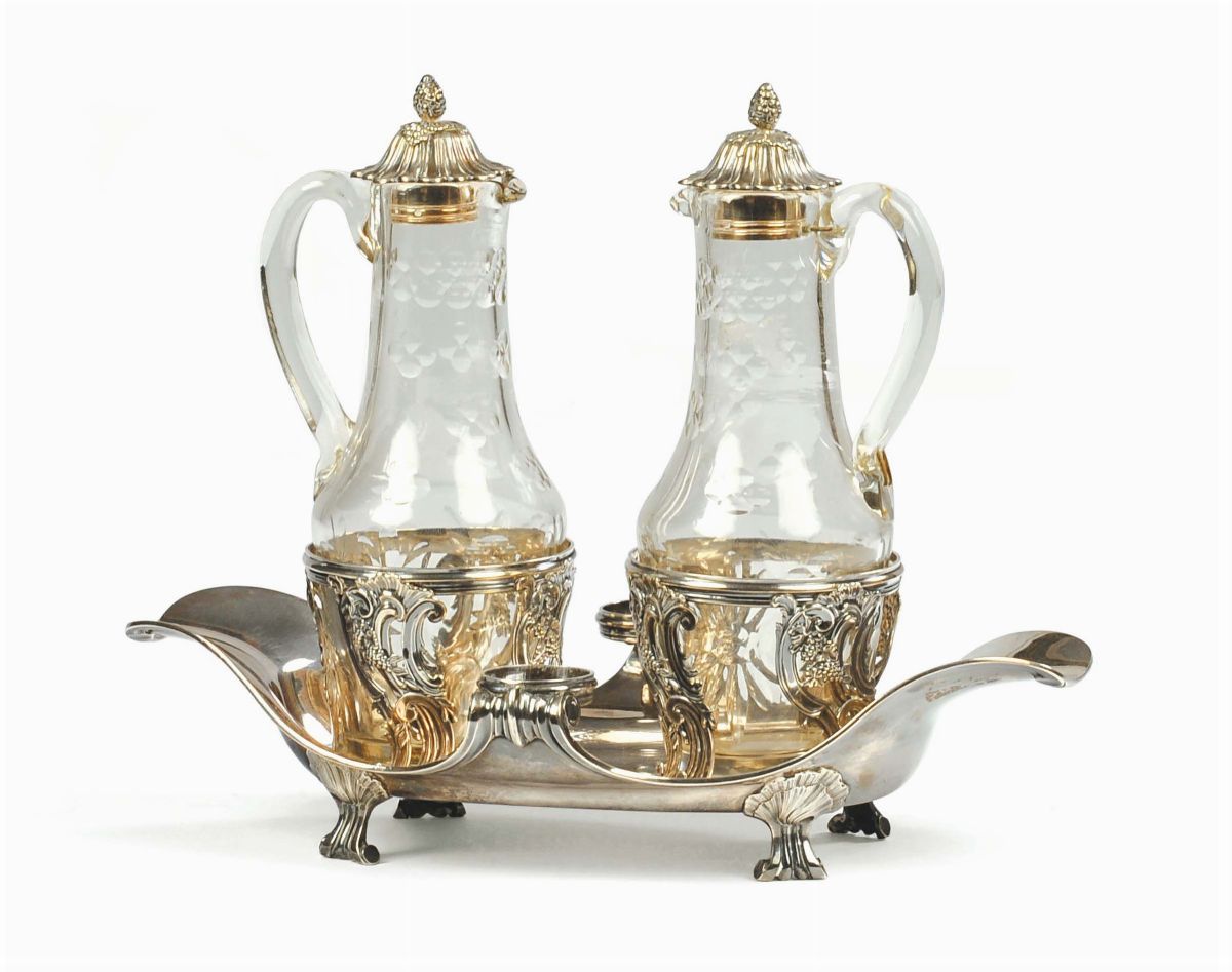 vassoio a barca poggiante su quattro piedini a ricciolo, ampolle non coeve in cristallo con tappi in argento, punzoni sul fondo, cm 28x17x24