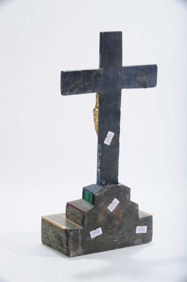 La croce in lapislazulo poggia su una base gradinata in malachite e altri marmi colorati, e reca una figura di Cristo in bronzo dorato, fuso e cesellato.