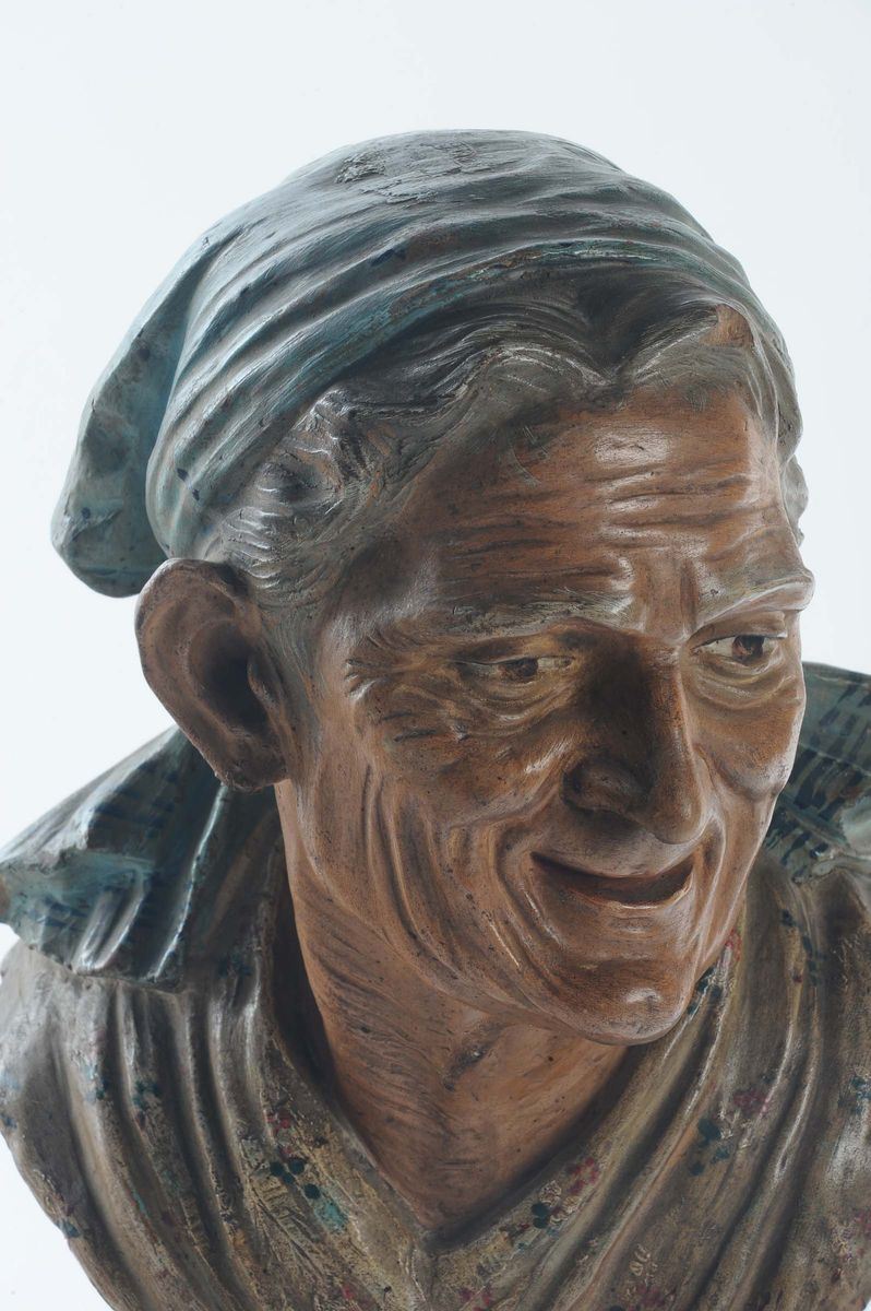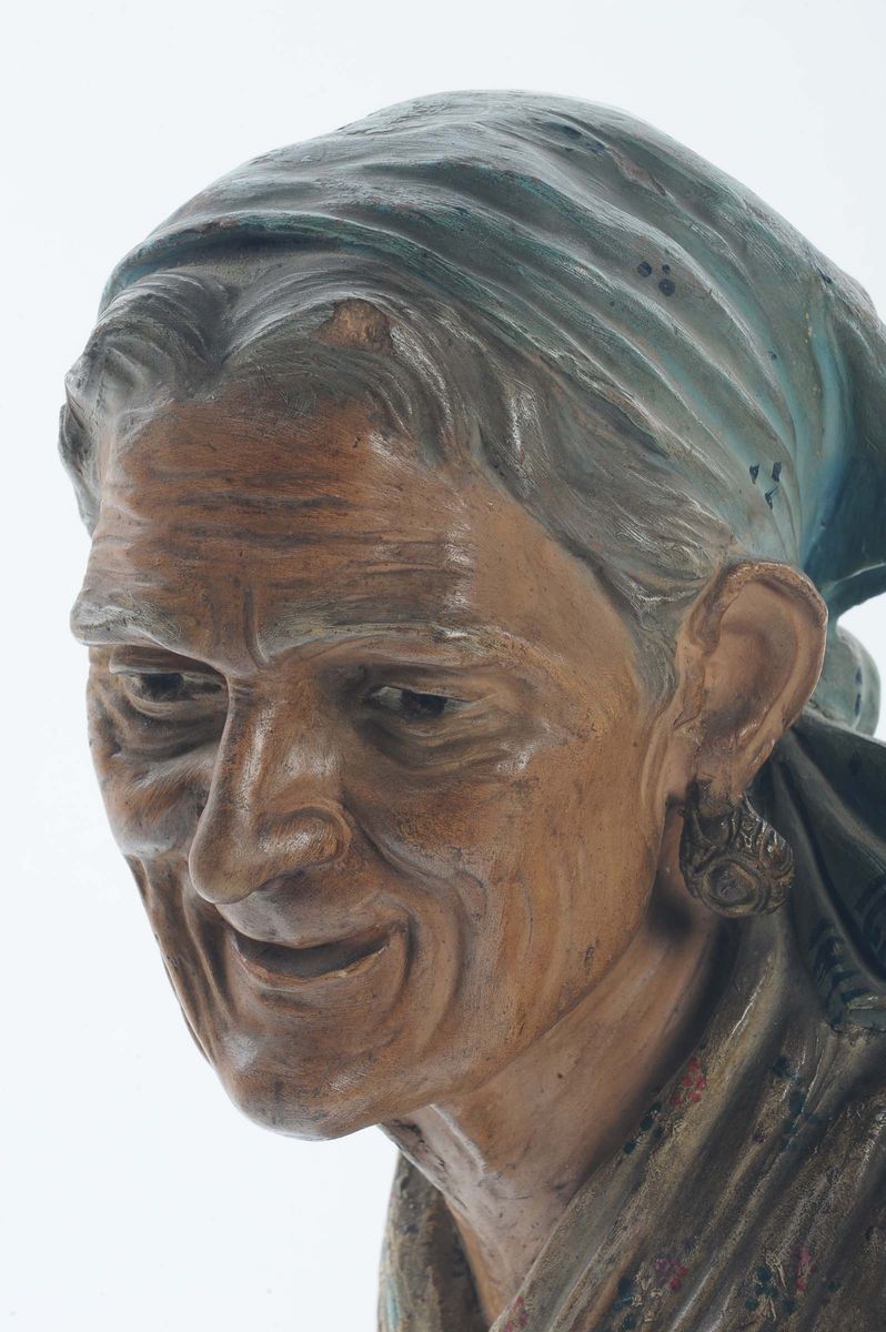 Piccola scultura in terracotta plicroma raffigurante realistico ritratto di vecchia, scultore del XIX secolo