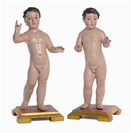 Rara coppia di sculture in legno policromo raffiguranti Gesù Bambino benedicente e San Giovannino, Napoli fine del XVIII secolo