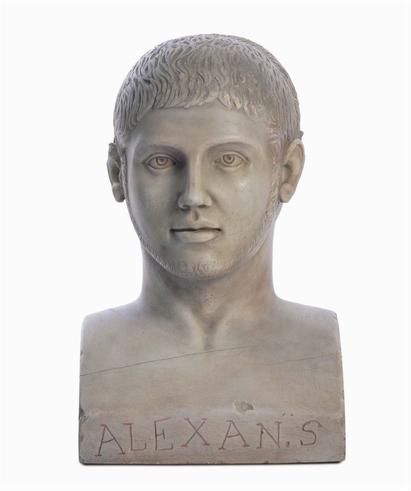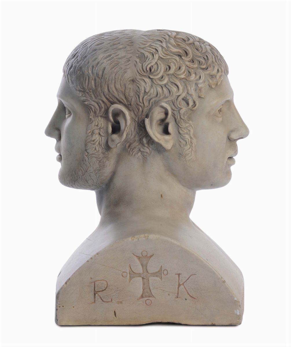 Scultura neoclassica in marmo bianco bifronte raffigurante i volti di Marco Aurelio Antonino (Eliogabalo) e Alessandro Severo, [..]