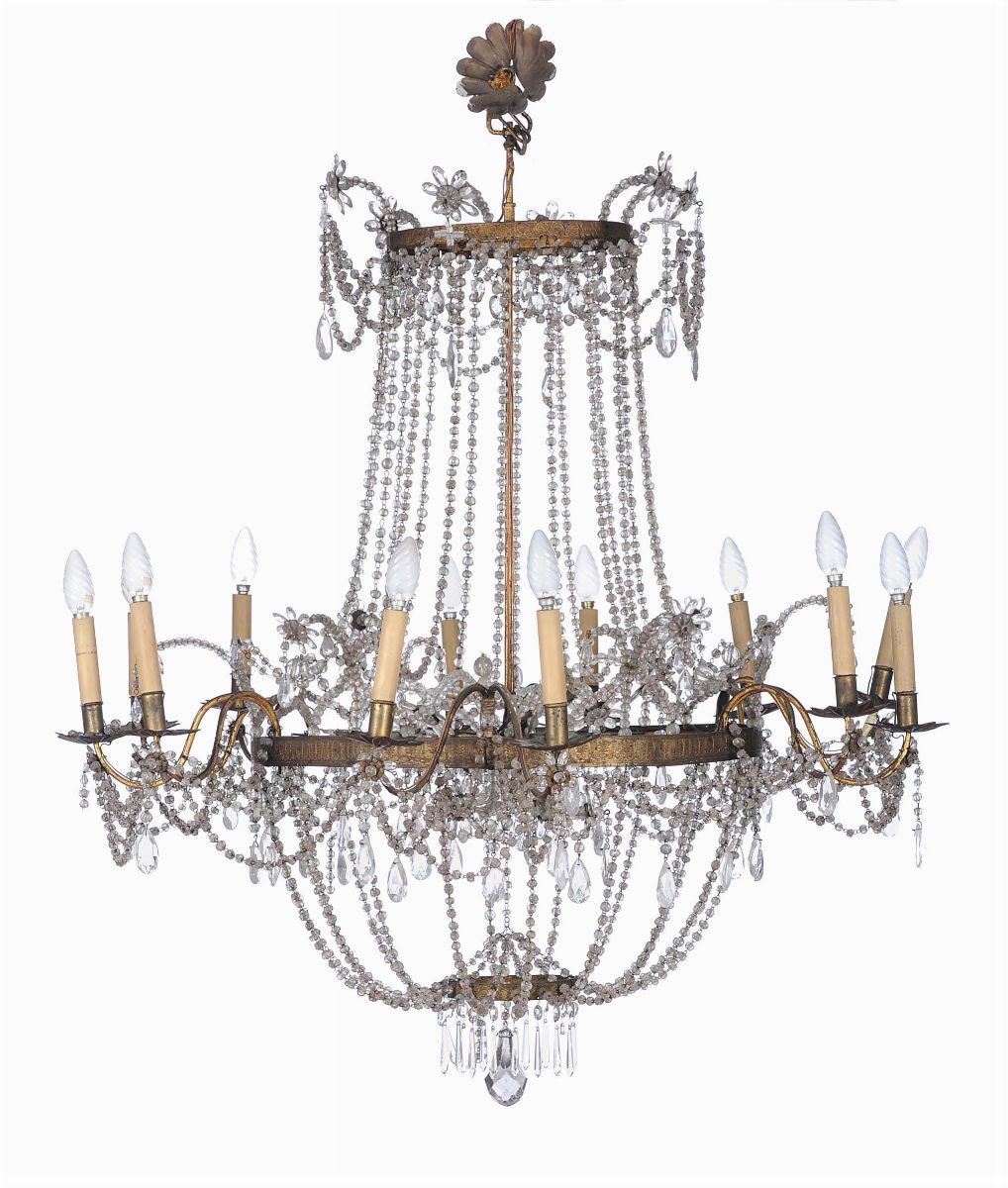 Lampadario in bronzo e cristalli a dodici luci