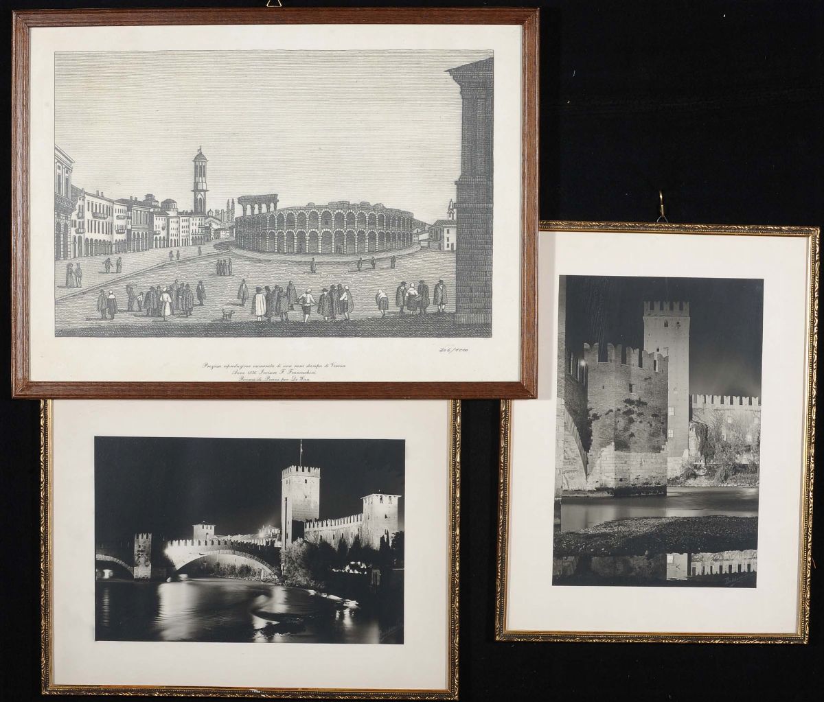 Lotto di tre stampe con vedute di Verona