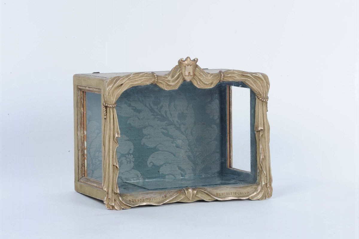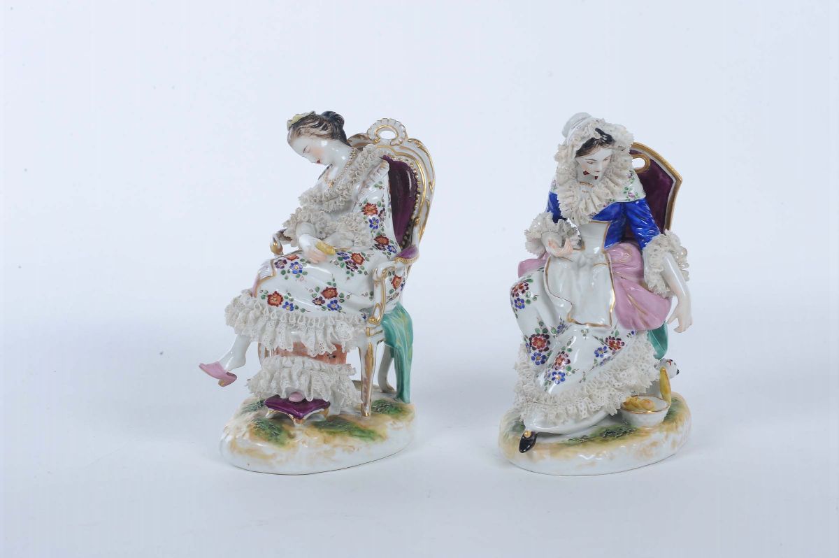 Coppia di statuine in porcellana con figure femminili in teca di legno