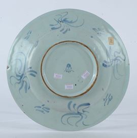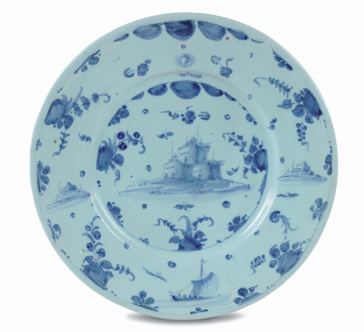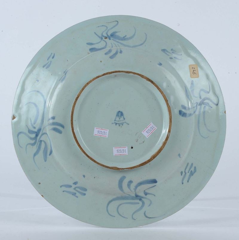 decoro con paesaggio a motivi vegetali in blu e bianco, diametro cm 31,5