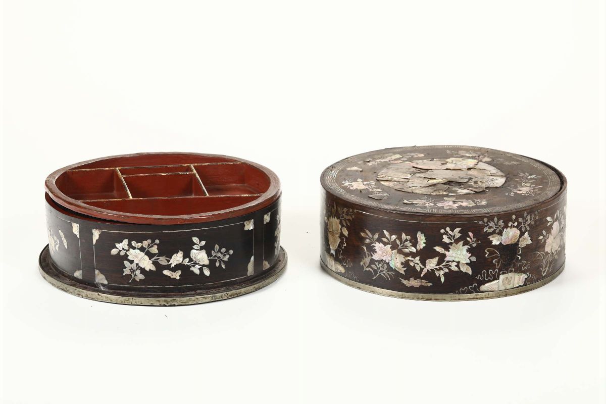 Scatola cilindrica laccata ed intarsiata in madreperla, Cina XIX secolo