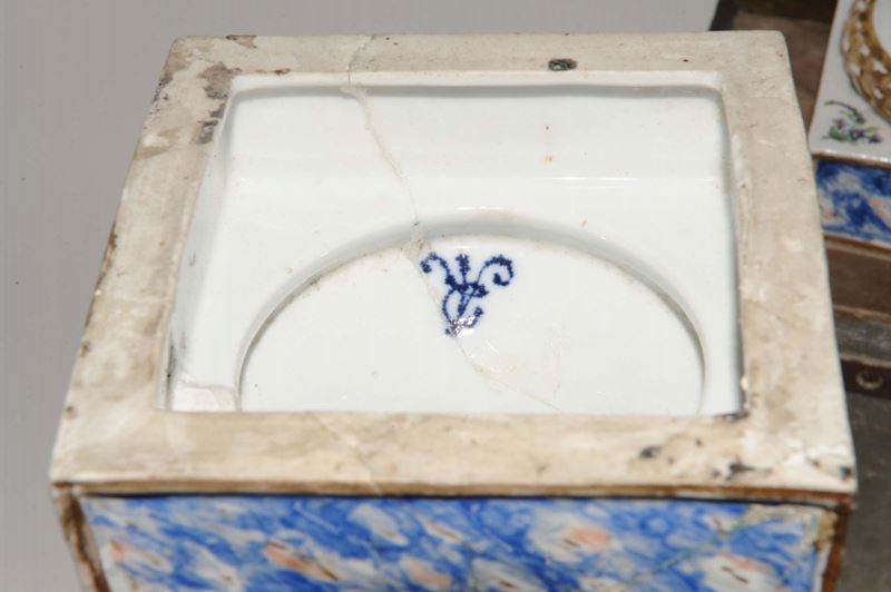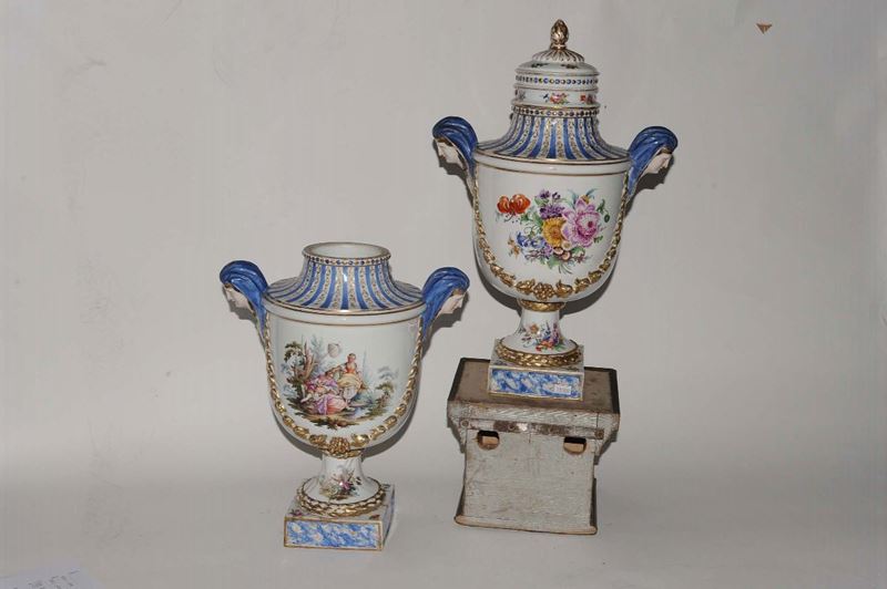 Coppia di vasi Neoclassici in porcellana dipinta in policromia