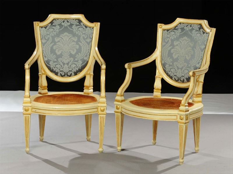 Coppia di poltrone Luigi XVI laccate in bianco e oro, Genova XVIII secolo