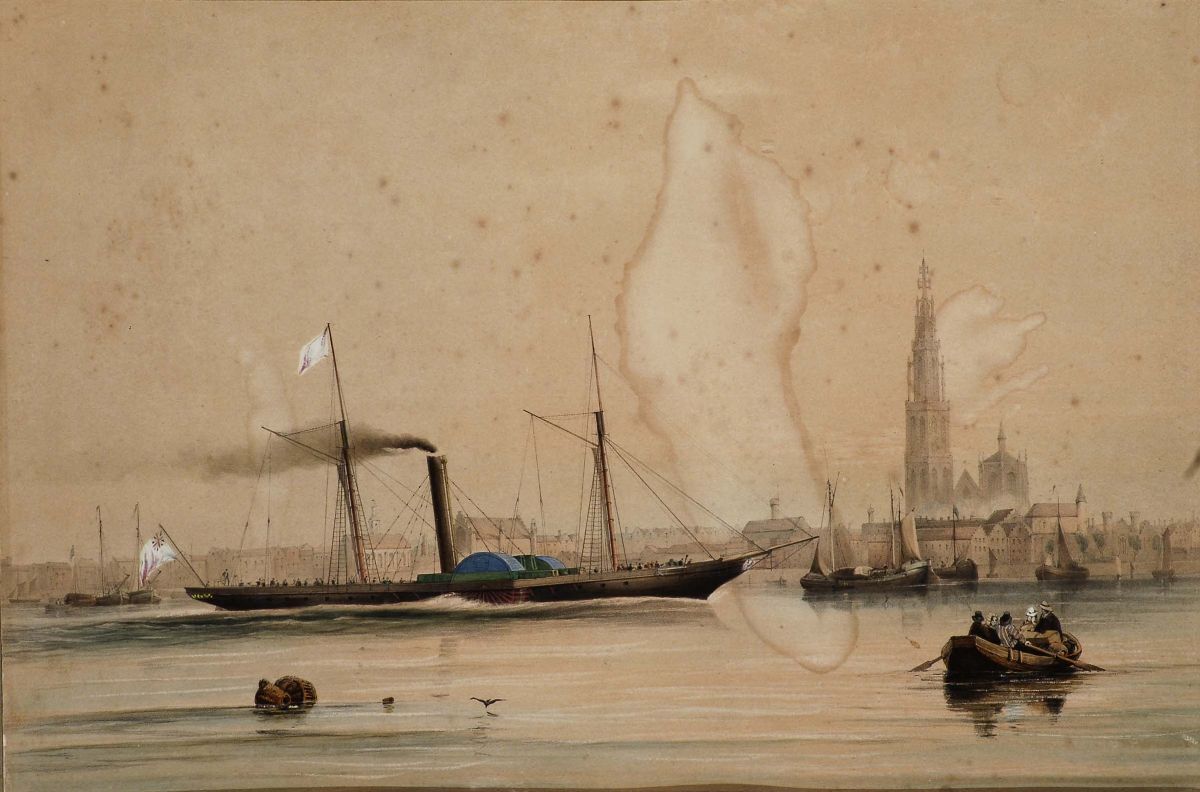 Ritratto di steam yacht battente bandiera inglese davanti a città del nord Europa