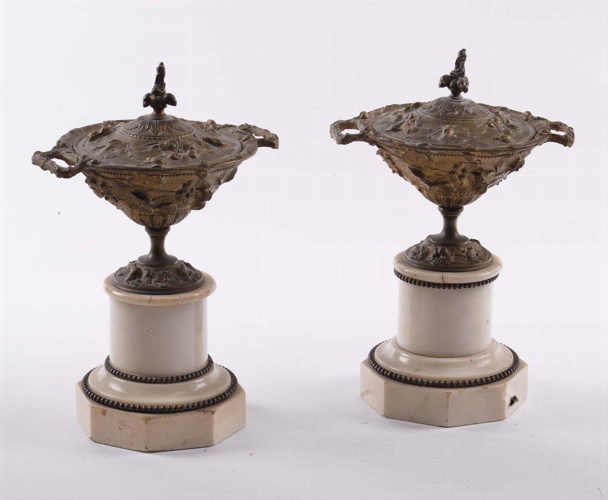 Coppia di coppette in bronzo e marmo con coperchio
