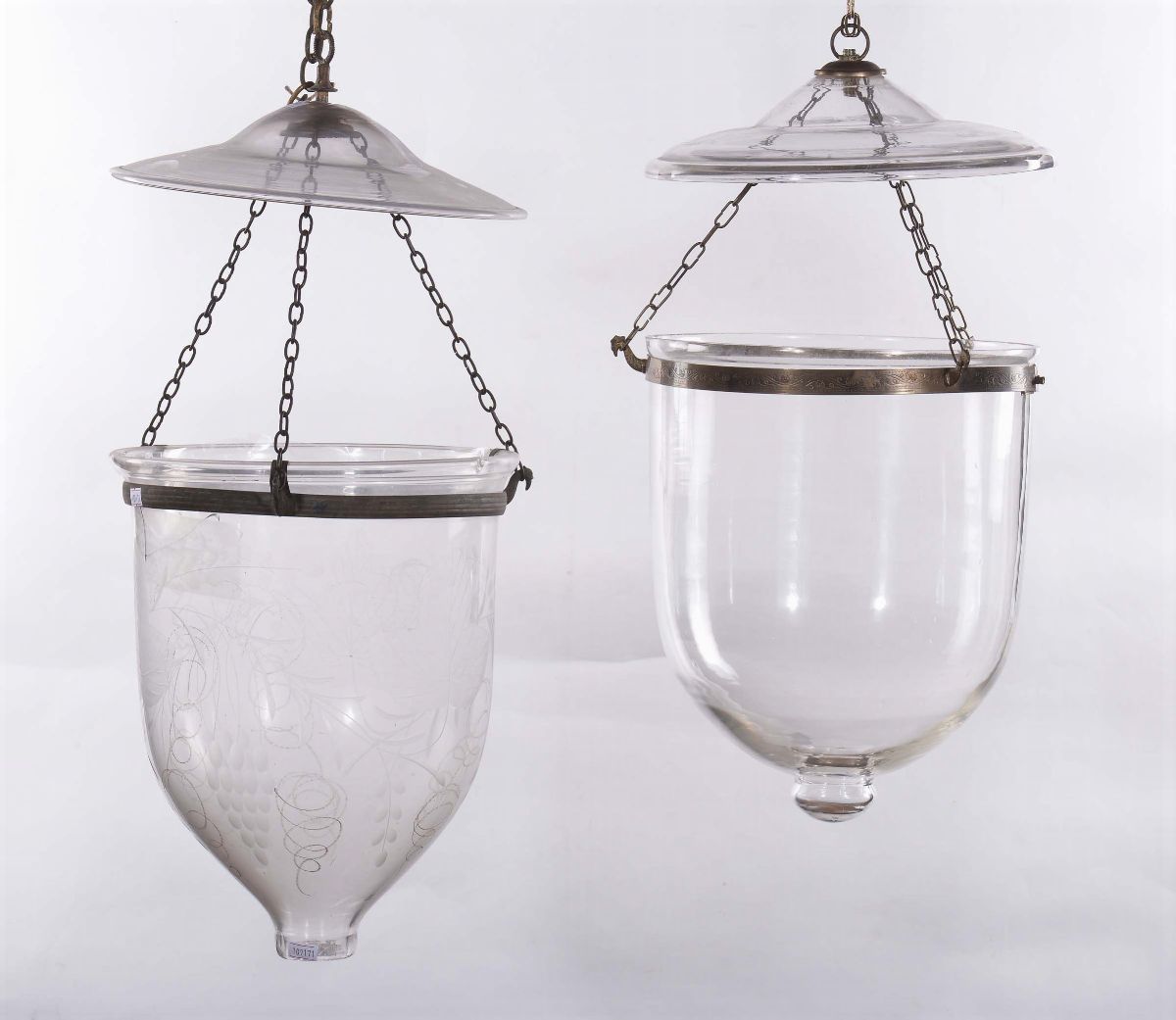 Due lampadari differenti in stile antico in bronzo e vetro