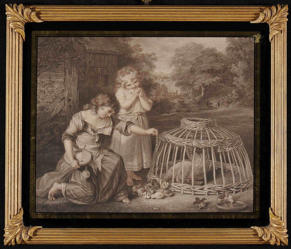 Incisione punto a seppia raffigurante bambine con pulcini, Francesco Barlolozzi fine XVIII secolo