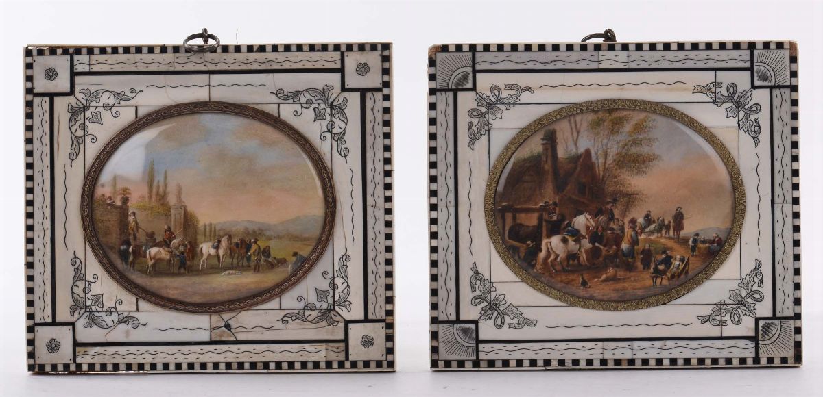 Coppia di miniature con cornice lastronata in avorio