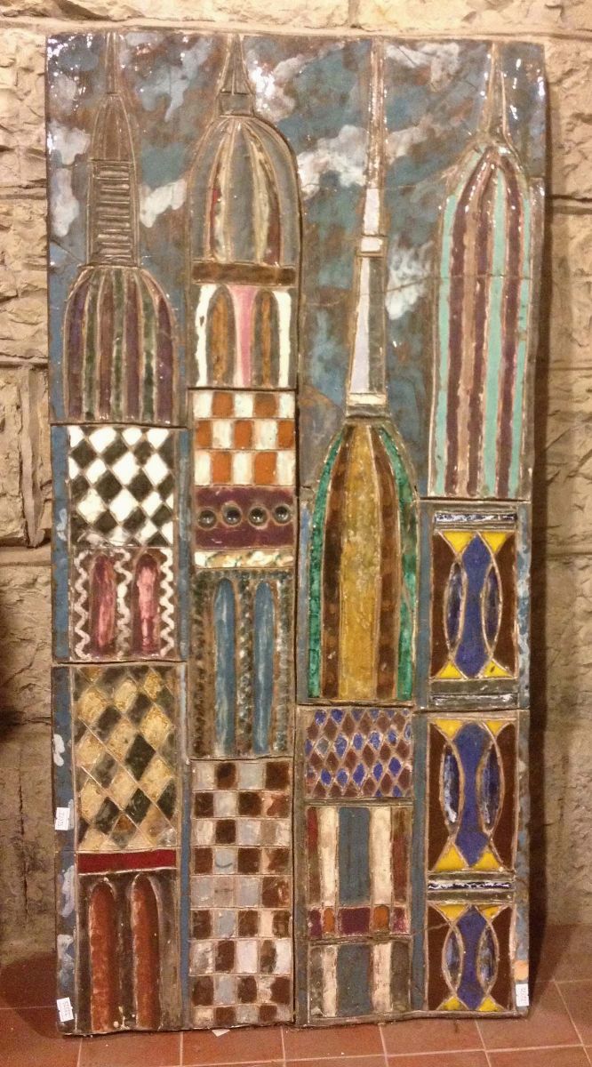Pannello in ceramica policroma raffigurante torri geometriche con cupole, XIX secolo