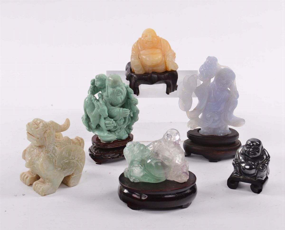 composto da cane cinese in pietra, Buddha in pietra nera, Buddha assiso, Buddha in pietra marrone, ragazzo con dischi, piccolo Buddha giallo e scultura di filosofo turchese