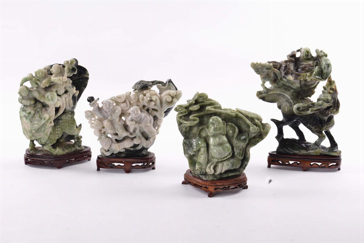 composto da gruppo in giada nera (pesce e due bambini), gruppo in giada verde (tre bambini e drago), Buddha e Buddha su drago