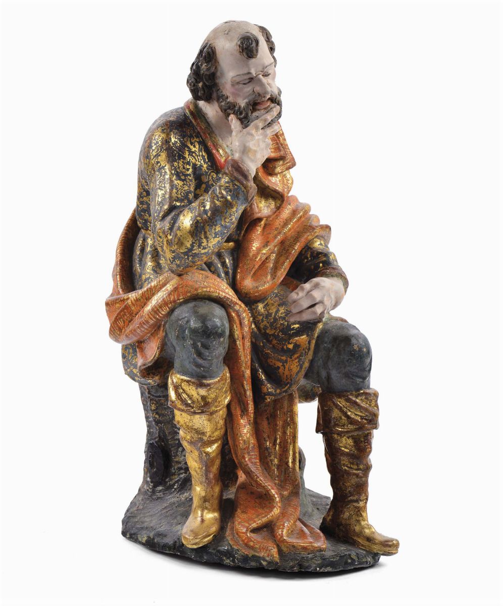 Scultura in legno intagliato e laccato raffigurante uomo seduto, XVIII secolo