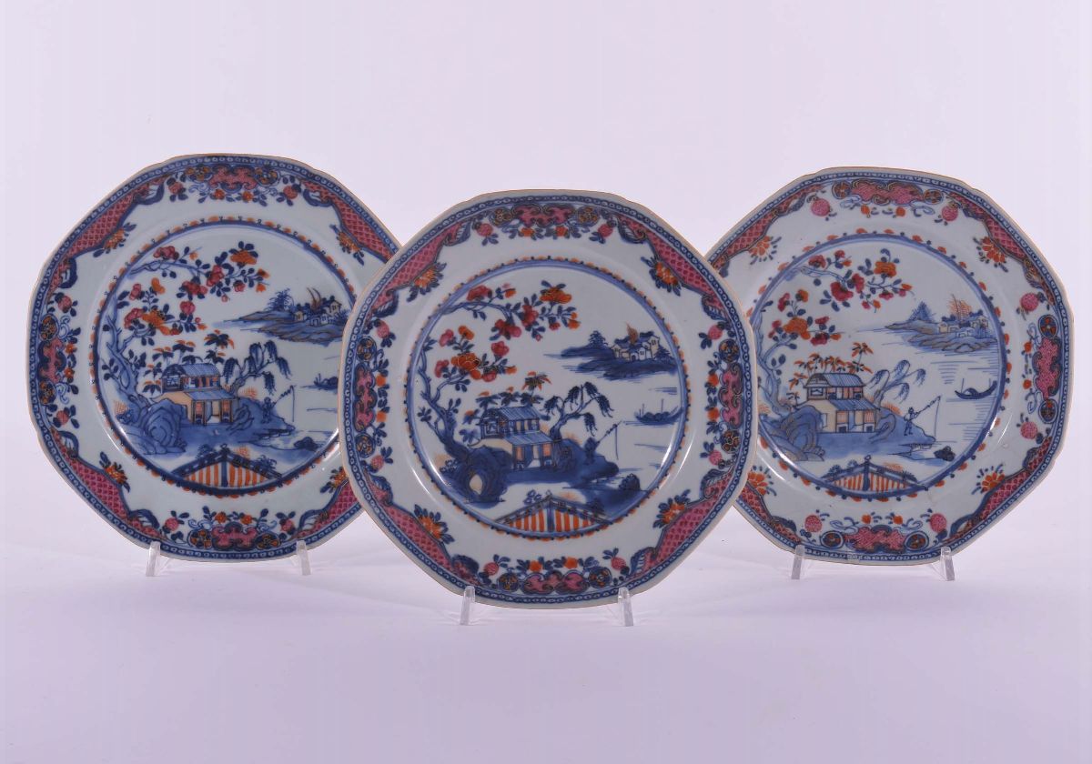 Tre piatti ottagonali con paesaggi, Cina fine XVIII secolo