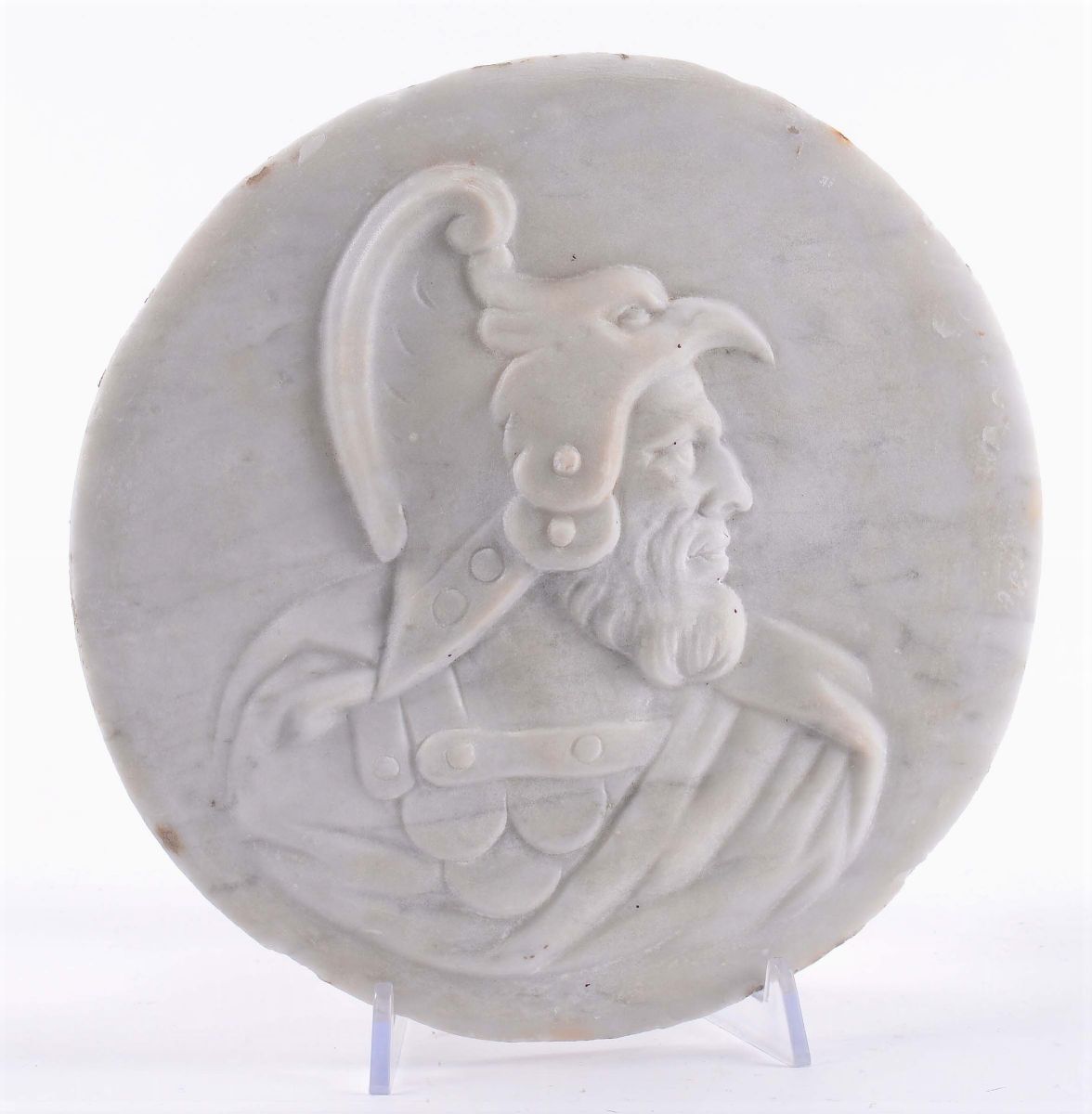 Placca circolare in marmo bianco raffiguante profilo di guerriero, XIX secolo