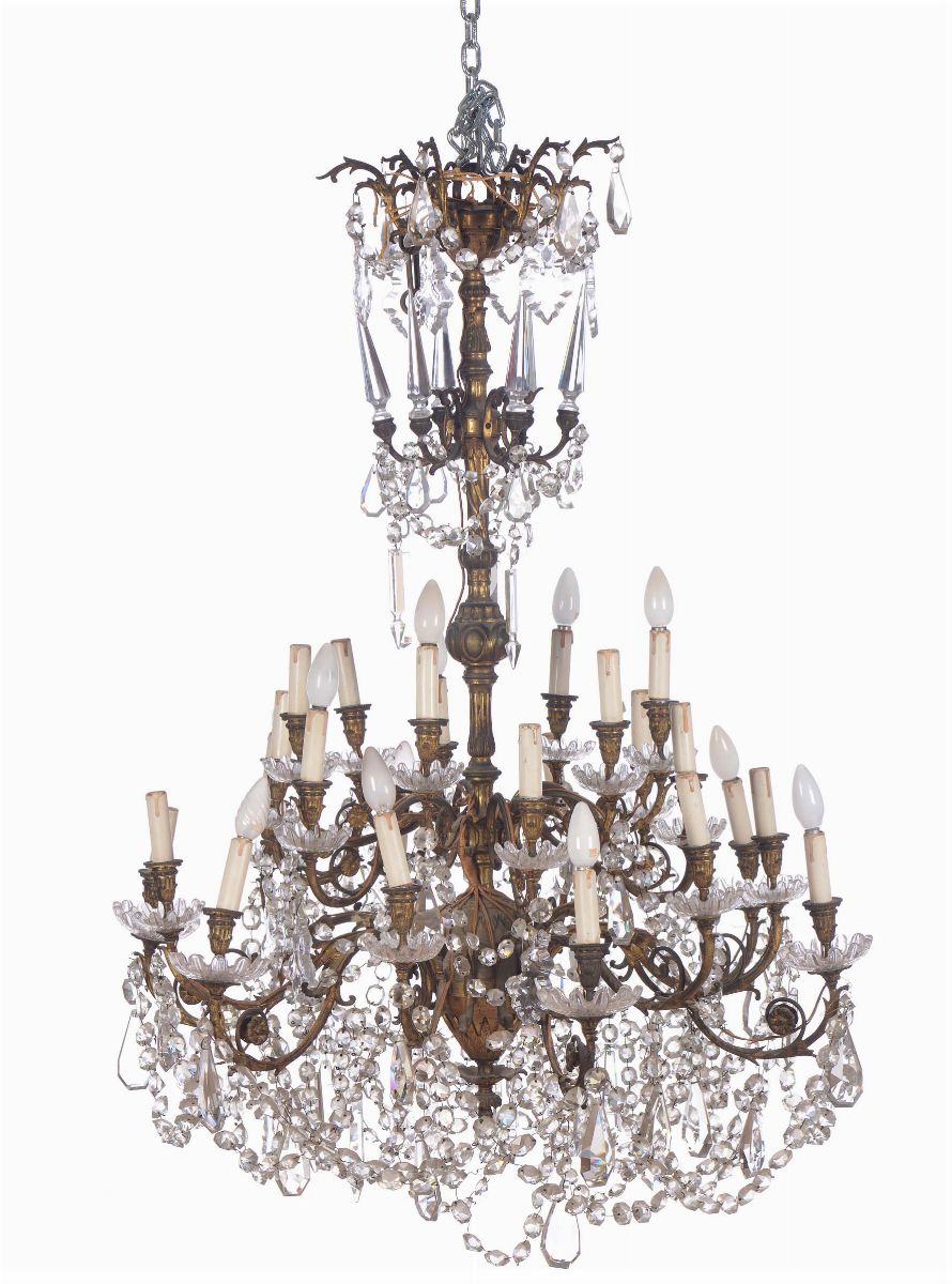 Lampadario in bronzo e cristalli a 24 luci disposte su due ordini di bracci