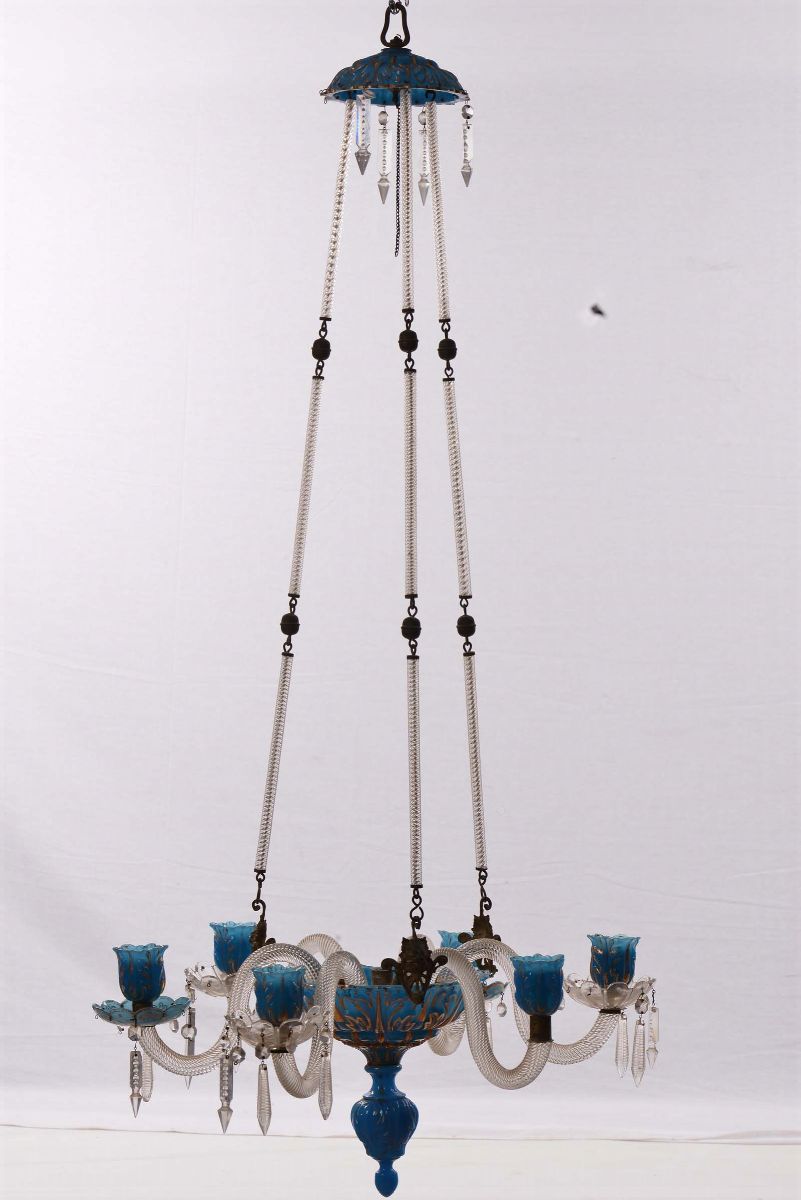 Lampadarietto a sei luci in critalli blu e incolore e bronzi