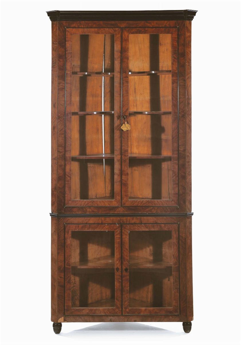 due ante a vetro alla base e due ante nell'alzata, cornici e piedini ebanizzati, cm 77x77x253