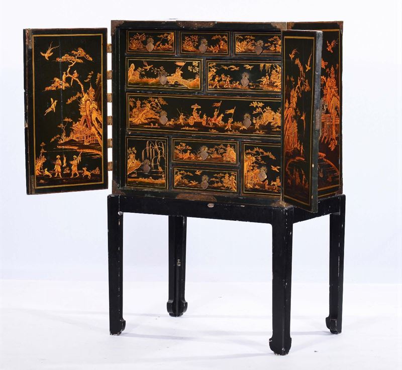 Cabinet in legno laccato e decorato in oro con raffigurazioni di scene orientali, Inghilterra XVIII secolo