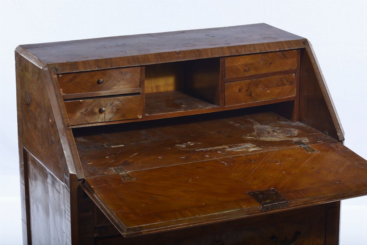 fronte dritto a tre cassetti, calatoia celante scarabattolo, piedi a mensola, cm 88x53x108 (difetti)