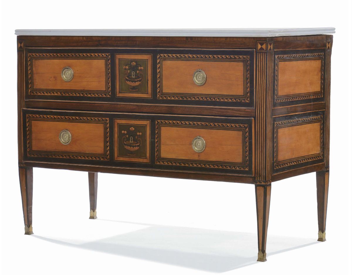 Comò Luigi XVI a due cassetti lastronato ed intarsiato, Napoli XVIII secolo