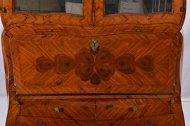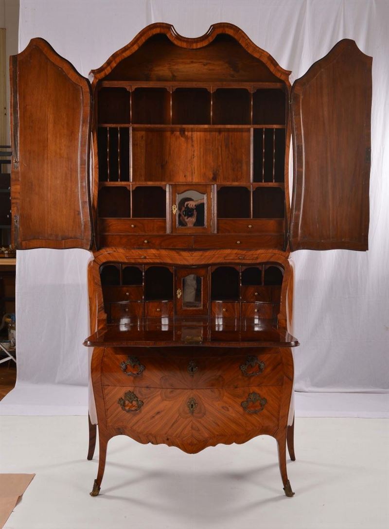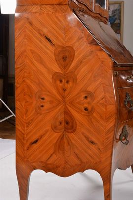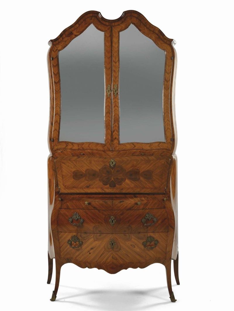 fronte e fianchi mossi, base a due cassetti, calatoia che cela cassettini, vani a giorno ed antina a specchio centrale, alzata a due ante con numerosi scomparti all’interno ed antina centrale, alte gambe arcuate con scarpette in bronzo dorato, cm 116x58x235