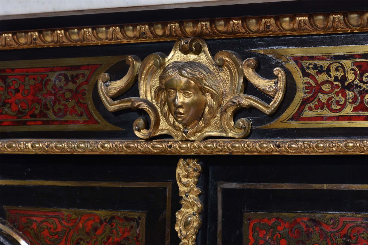 fronte intarsiato in tartaruga e ottone a motivo vegetale, applicazioni in bronzo dorato su fianchi e montanti, piano in marmo bianco, cm 126x39x104 (difetti)
