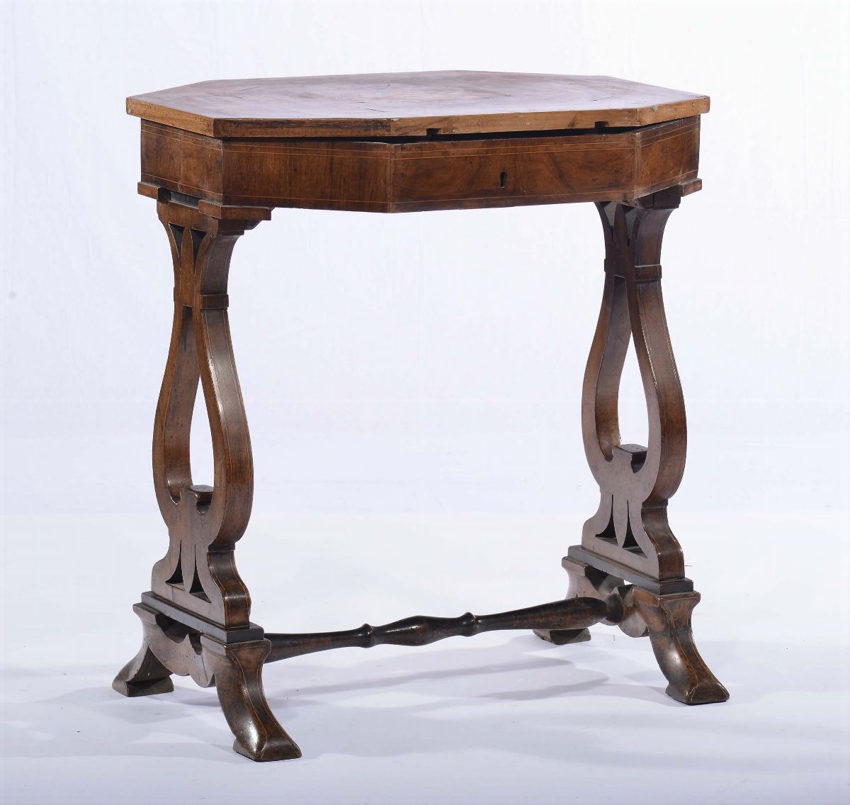 Tavolino da lavoro con piano ottagonale scorrevole intarsiato in legno dolci, XIX secolo