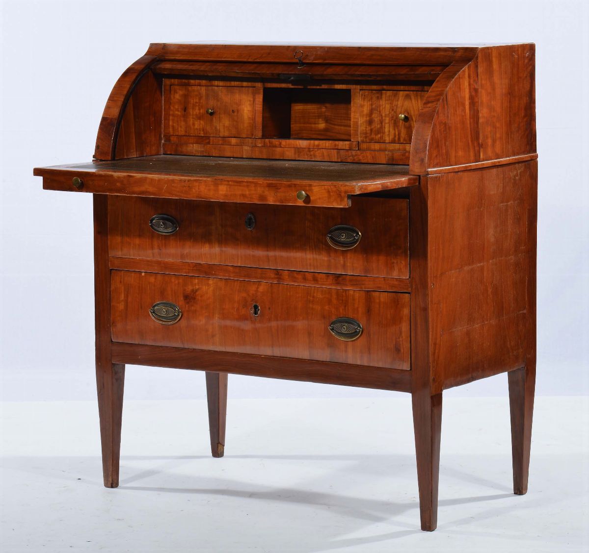 gambe troncopiramidali, rullo che cela cassettini , vano a giorno e scrittoio estraibile con piano in pelle, cm 89x47x103
