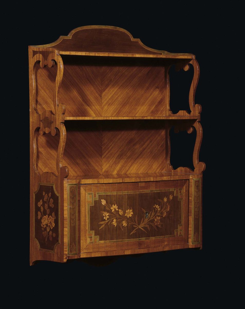 lastronata a marqueterie in bois de rose e bois de violette a decoro floreale, due ante alla base, cm 45x17x60
