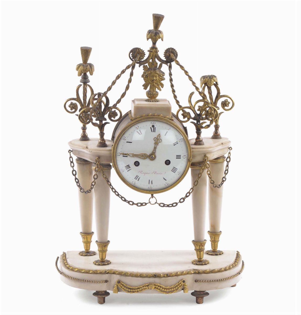 Orologio Luigi XVI a tempietto in marmo bianco e bronzo dorato, Francia XIX secolo