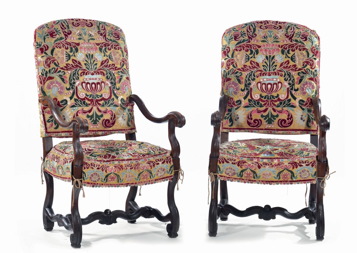 Coppia di poltrone in noce ad ossa di montone, Genova inizio XVIII secolo