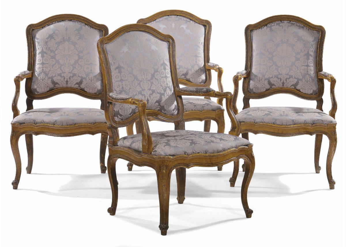 Quattro poltrone Luigi XV in legno dorato, XVIII secolo