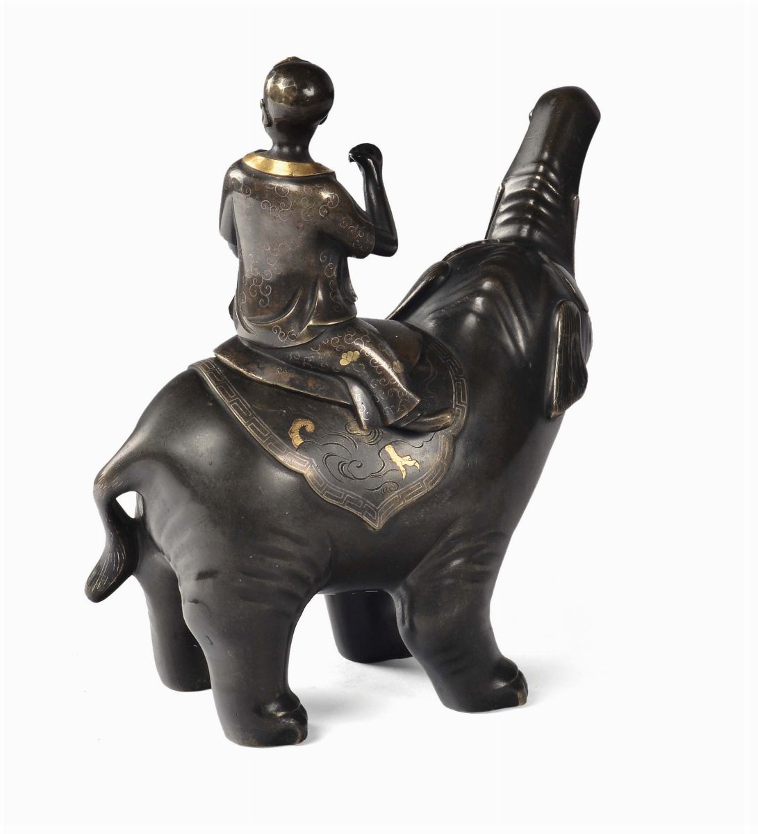 Dark coat bronze child on elephant partially gilt, China, Shisou family, Qing Dynasty, first part of 19th century, h cm 23