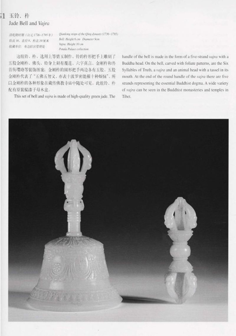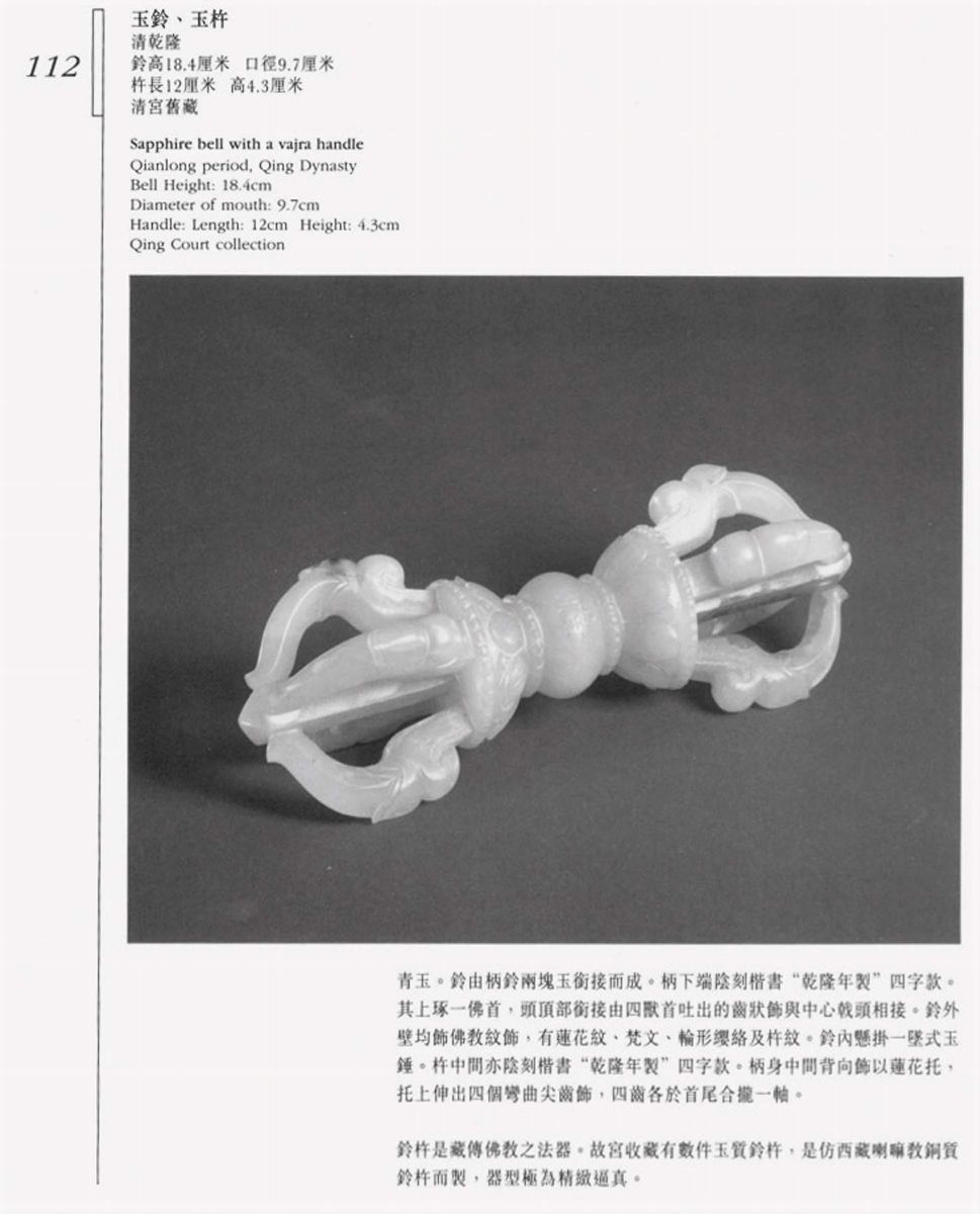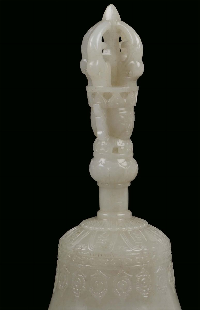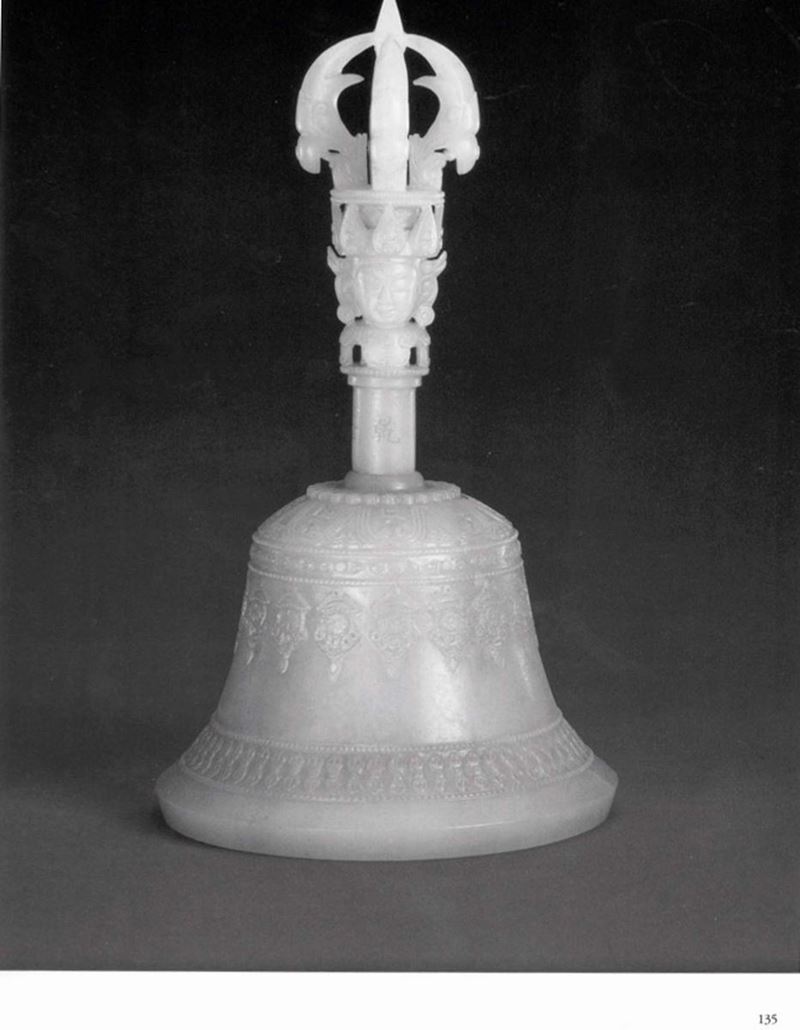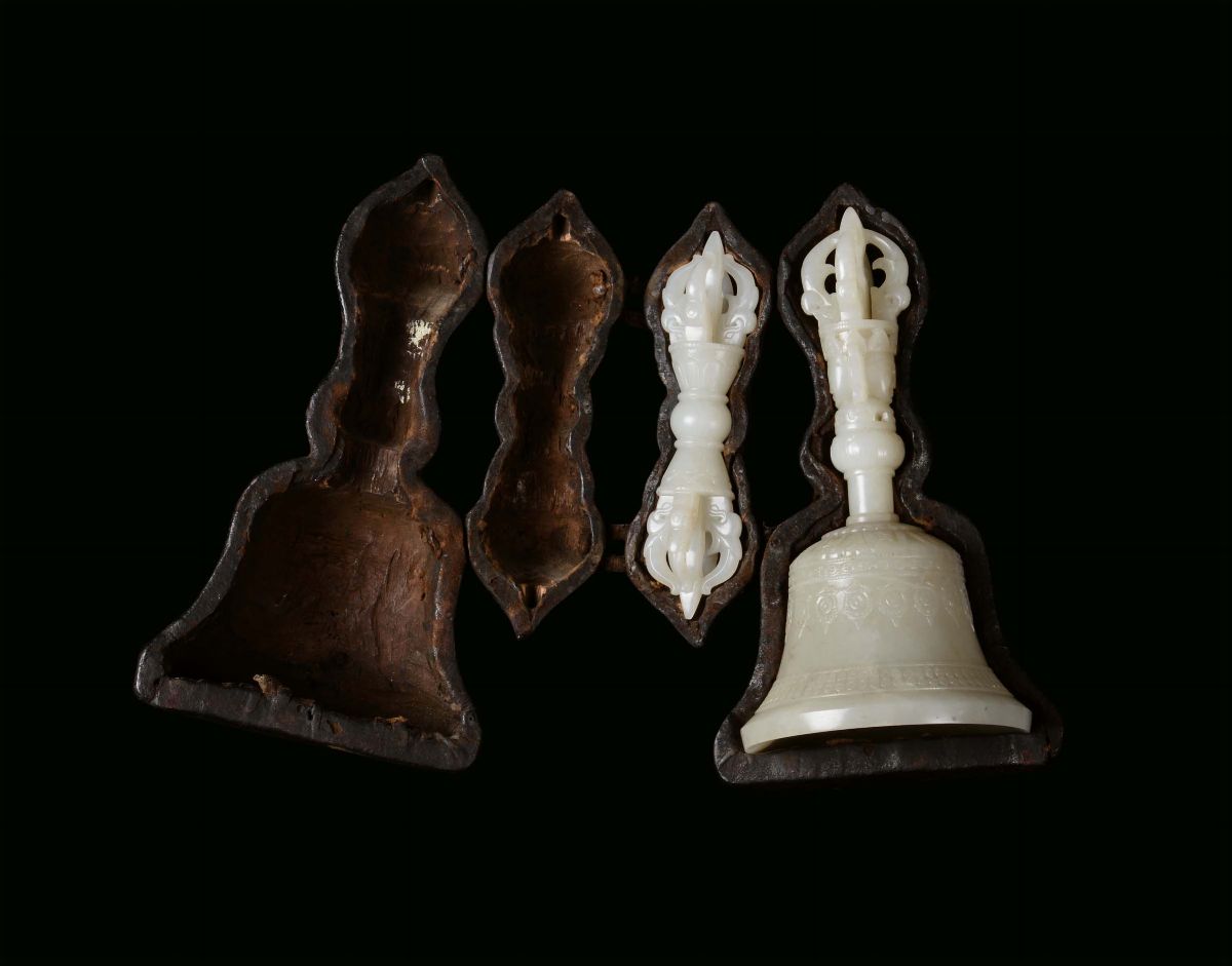 h cm 17,2, entro custodia in pelle nera, dorje cm 13Un simile esempio di campana e dorje sono esposti al Palazzo Imperiale di Pechino. Rif. The Complete Collection of Trasures of the Palace Museum, Jadeware, (III), Volume 42, pp. 134-135, no. 112.Un altro esemplare è conservato nella collezione di Potala Palace di Lhasa e pubblicata sul “ Treasures from Snow Montains Gems of Tibetian Culturals Relics, Chien Xiejun, pag. 131 n. 51