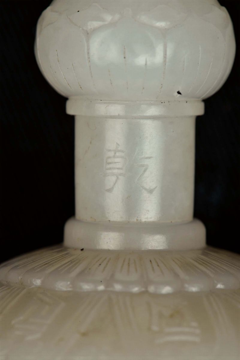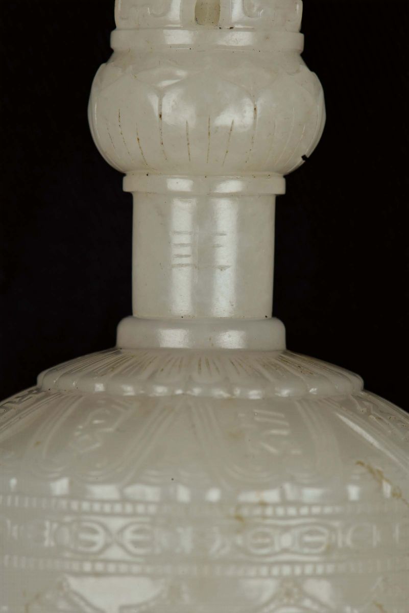 Extraordinary and rare white jade bell or guanta with dorje or vajra of imperial manufacture, both with Qianlong mark and the Period, China, Qing Dynasty, Qianlong Period (1736-1795) h cm 17,2, in a black skin cover, dorje cm 13 Such an example of bell and dorje are displayed at the Emperors Palace in Beijing. Reference. The Complete Collection of Treasures of the Palace Museum, Jadeware, (III), Volume 42, pages 134-135, no. 112. Another exemplar is preserved in the Potala Palace Collection in Lhasa and published on “Treasures from Snow Mountains Gems of Tibetan Cultural Relics”, Chien Xiejun, page 131 n. 51