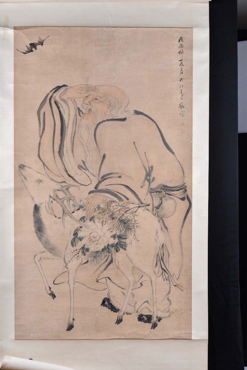 Ink painting on rice paper representing wise man with dog, China, 20th century cm 79x136, inscriptions and seals